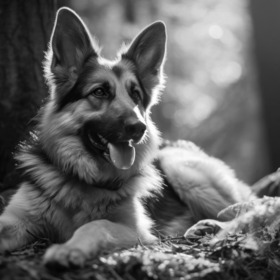 hunde, tiere, wald, schwar … des im wald im stil … schaeferhund im wald bild au